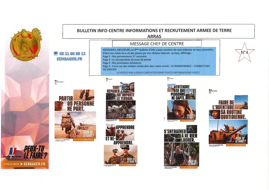 Ci-joint le flash info du Chef du centre d’information et de recrutement des forces armées TERRE. FLASH INFO 4 PDF